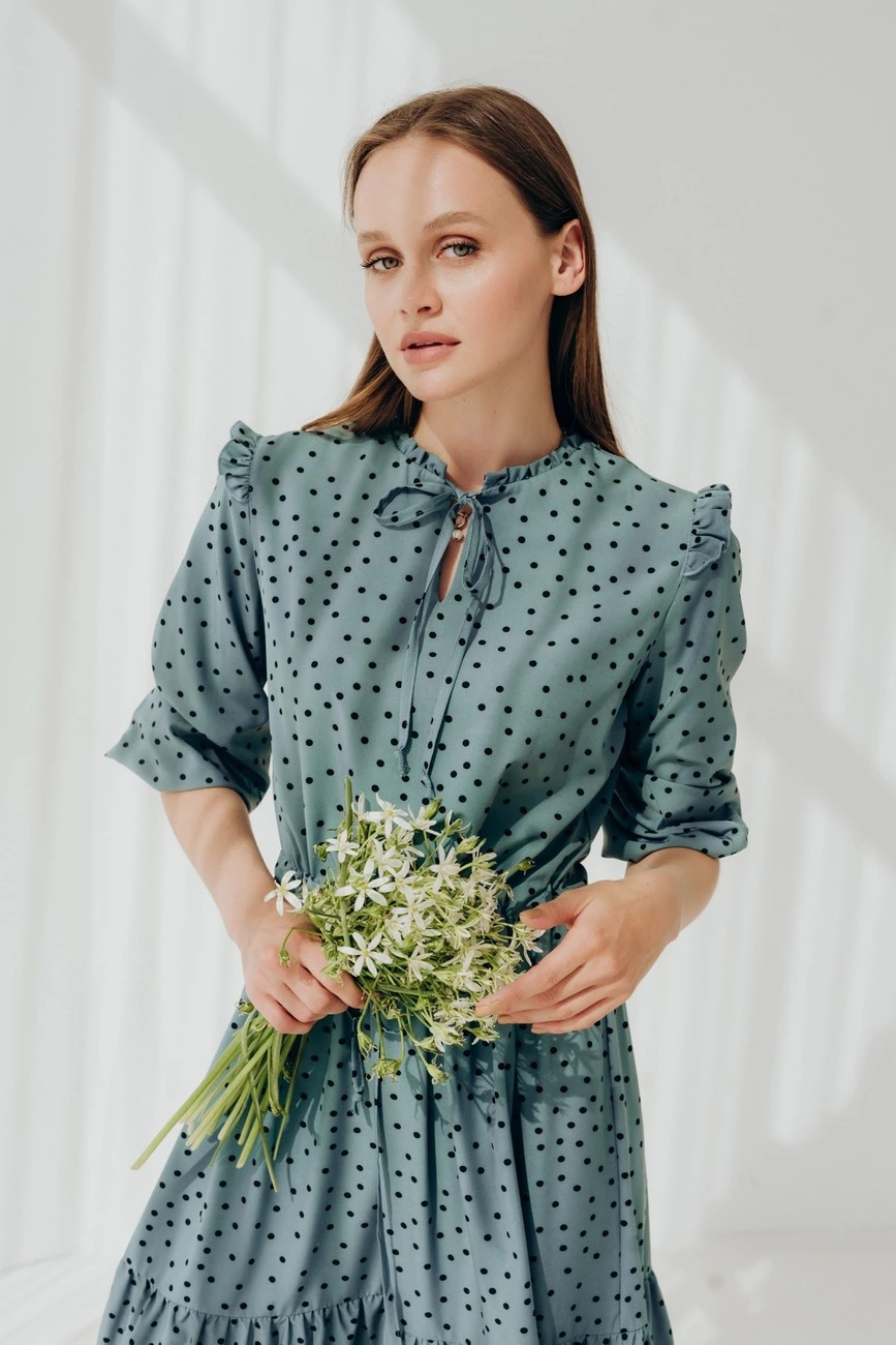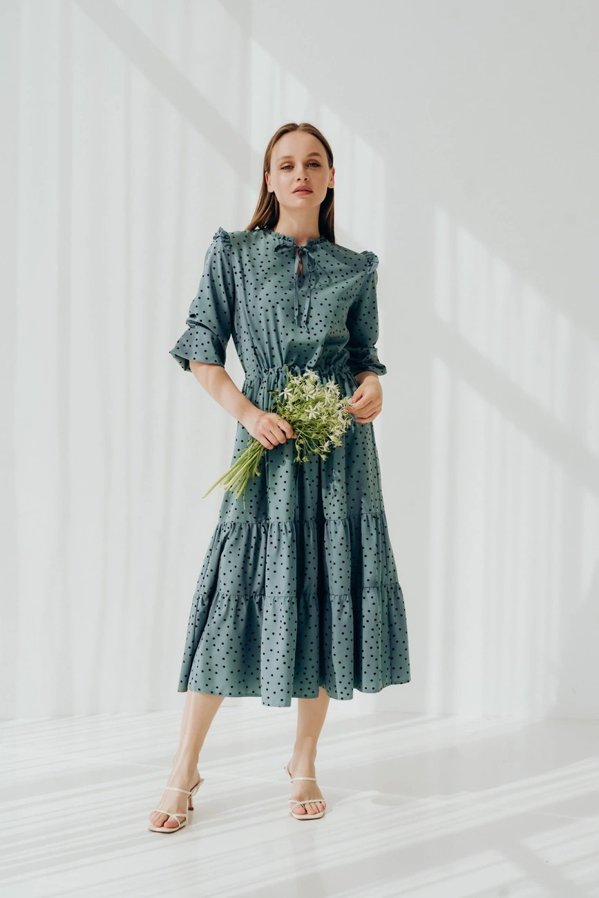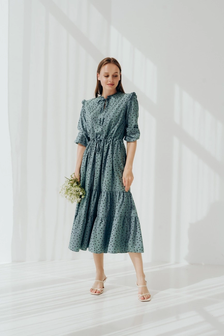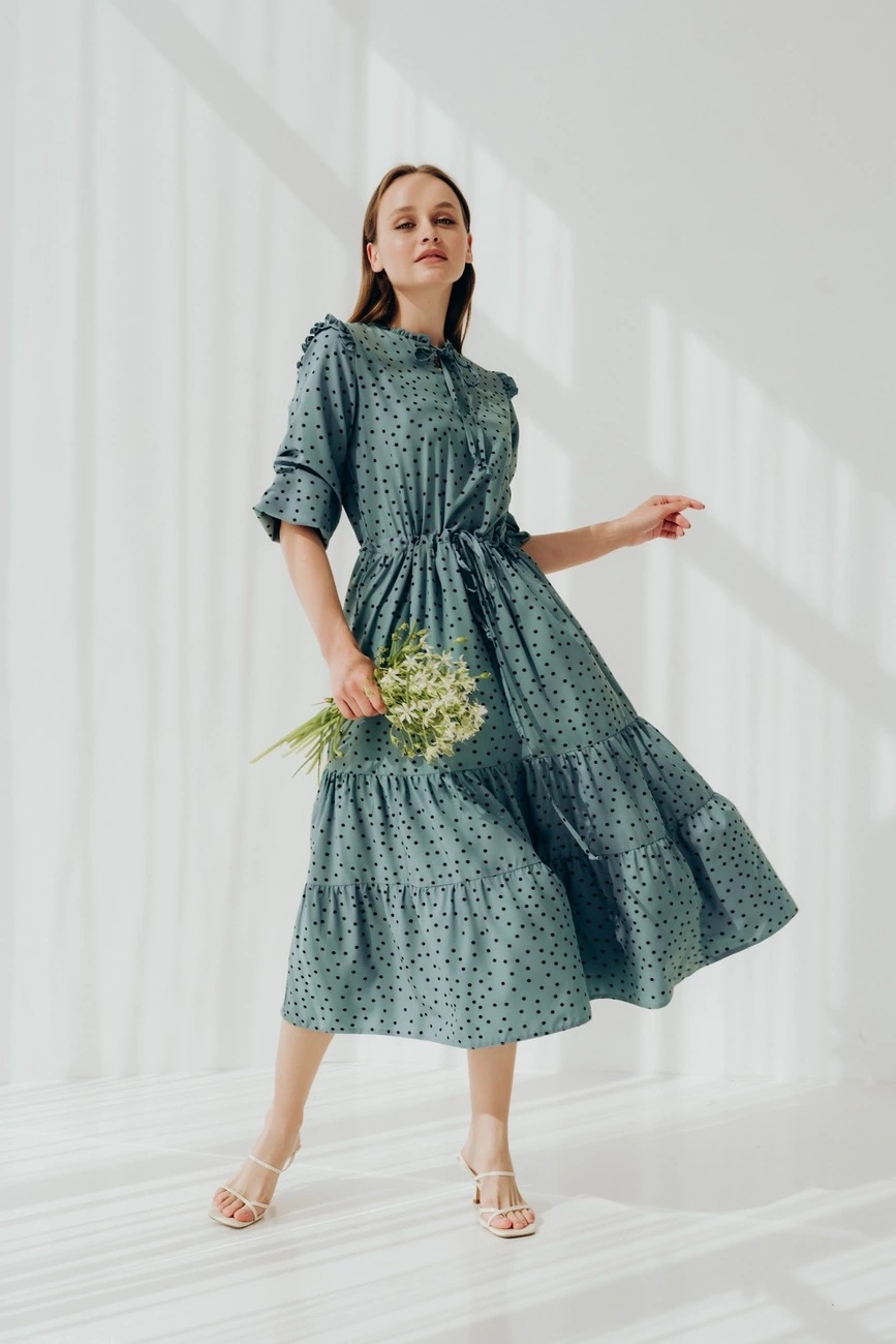 Романтична сукня міді довжини. Комір сукні та талія на тендітній