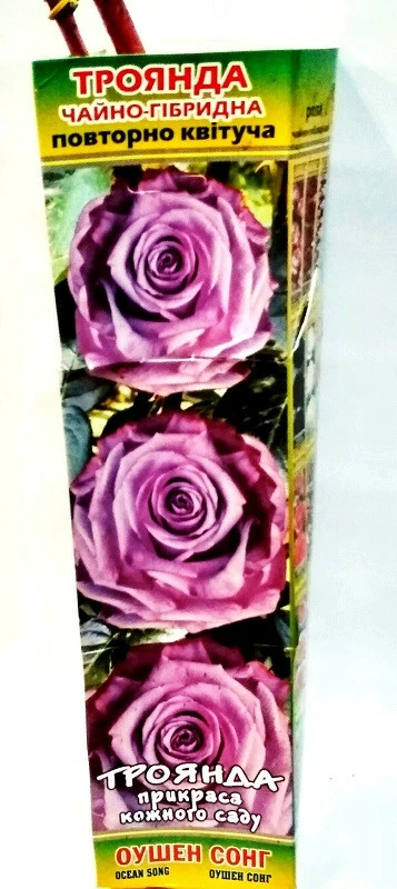 Роза Оушен Сонг имеет необычный лавандовый цвет лепестков, с фисташковым переходом к краю бутона. Цветок густомахровый - 40-50 лепестков, которые плотно уложены в бокал с высоким центром, при полном роспуске края лепестков сворачиваются в треугольники. Цветы крупные - 10 см в диаметре, обычно появляются по одному, на длинных побегах или собраны в кисти по 3-7 шт., хорошо переносят дожди и полуденное солнце. Сорт Оушен Сонг формирует прямые, мощные кусты высотой 120 см, 70 см в ширину. Сорт отлично выдерживает солнце, также может расти и в полутени.