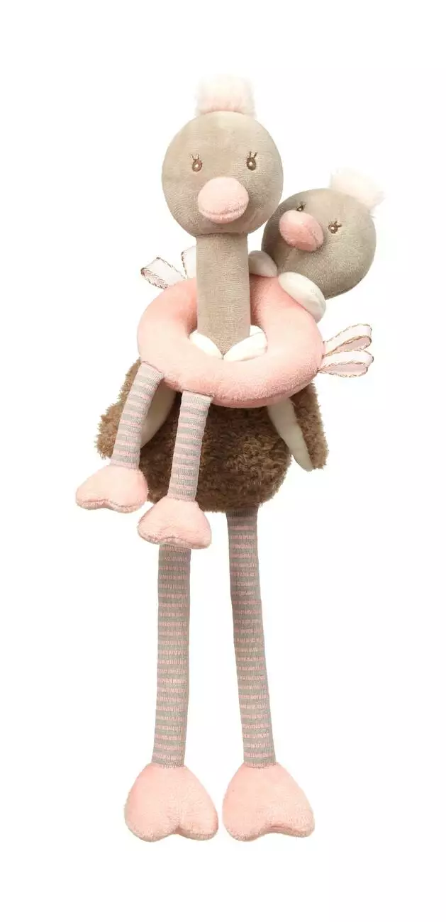 <p>Багатофункціональна м'яка іграшка та брязкальце "Страуси" із серії "Маленькі друзі", для гармонійного розвитку малюка від 3 місяців.</p><p>Мила пара страусів, Різнокольорові візерунки сприяють розвитку зору та сприйняття кольору. </p><p>Крильця й лапки шурхотять.</p><p>Брязкальце, пищалка в середині страуса розвиває реакцію на звуки.</p><p>Тканина різної текстури, розвиває тактильні відчуття.<br>Невиликий діаметр кілечка рожевого страуса, дає можливість дитинці захоплювати маленькою ручкою, розвиває хапальну навичку, координацію, дрібну моторику (від 4 місяців).<br><br>Всі матеріали натуральні та слино вбирають.<br>Елементи – м'які та безпечні.</p>