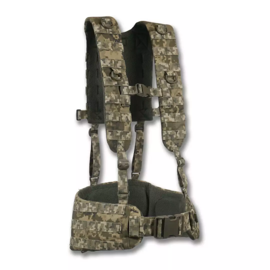 Конструкция. Плечевые лямки имеют рюкзачную конструкцию с ячейками MOLLE на спине для закрепления дополнительных итогов. Имеет внутренний слой полифома толщиной 5 мм и мягкую сетку для вентиляции. На лямках предусмотрено по 7 рядов MOLLE и нагрудный соединительный ремень на фастексе.