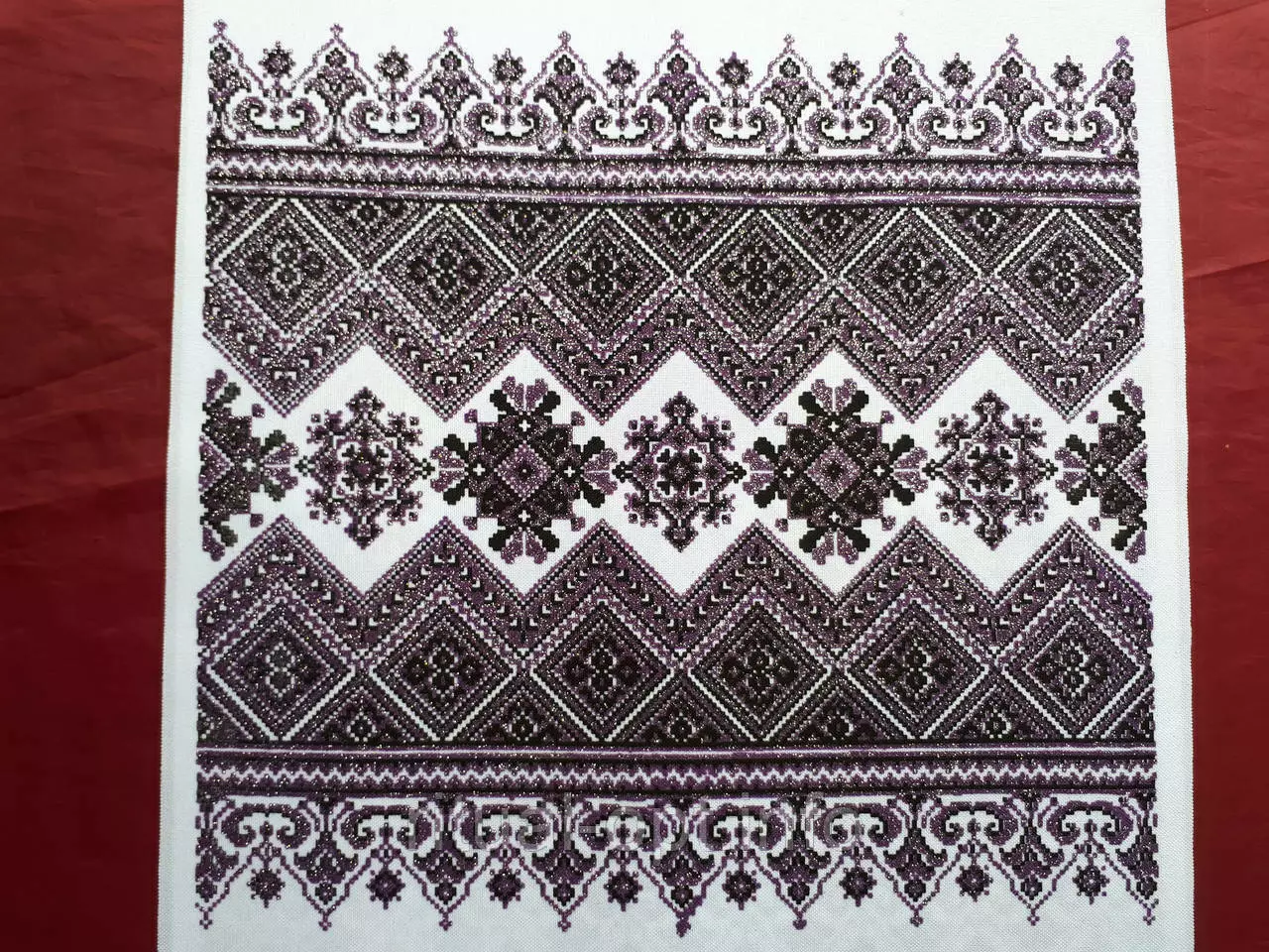 Рушник на хрест орнамент,Колір фіолетовий(темний).Розмір 150 на 30.Приємний відтінок.Повнокольоровий якісний друк з глітером "золото".