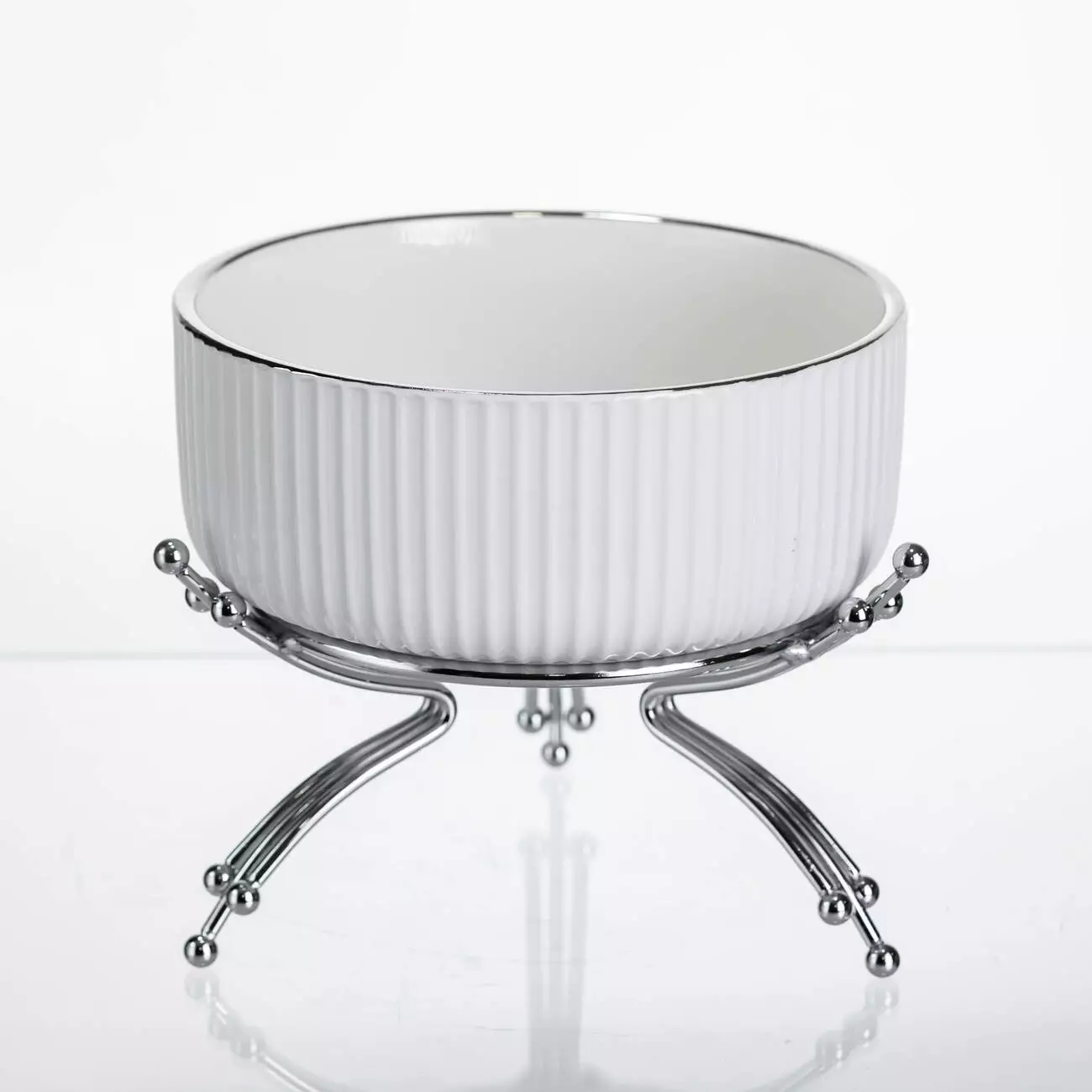 Порцелянова салатниця на металевій підставці призначена для подачі салатів, закусок або фруктів, забезпечуючи акуратний і впорядкований вигляд столу. Поєднання гладкої порцеляни та металевої основи створює витончений контраст матеріалів, який гармонійно вписується у будь-який стиль сервірування. Завдяки компактним розмірам салатниця зручна для використання як на щоденних обідах, так і під час святкових подій.