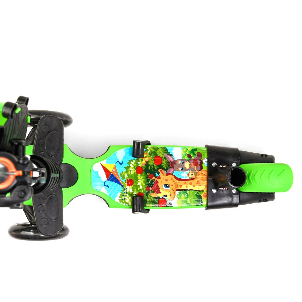 2 вида колес. Два передних светятся и изготовлены из полиуретана (PU), а заднее - из поливинилхлорида (пластика PVC); Размеры самоката: