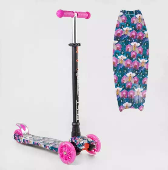 Триколісний самокат 779-2307 в стильному оформленні з відмінними характеристиками, яскравими колесами, що світяться - все, що необхідно для активного відпочинку дитини! Система керма має три рівні регулювання. Ручки виконані з якісної гуми із рельєфним візерунком для кращої фіксації в руках. Конструкція самокату складається з трьох коліс – два передні та одне заднє здвоєне. За рахунок матеріалу з якого виготовлені колеса даної моделі – поліуретан – самокат безшумний, а їзда на ньому м'яка та комфортна. Усі колеса під час руху світяться різнокольоровими кольорами. Оснащений ножним гальмом, що наступає (step-on brake), який розміщений над заднім колесом. Характеристики: • Розміри самокату: Ширина (з колесами) – 23 см; Ширина деки – 12 см, довжина – 41, корисна – 33 см; Мінімальна висота керма (від платформи) – 70 см, максимальна висота керма – 79 см; Ширина керма – 25 см, діаметр ручок: 4 см; • Розміри коліс: Передні колеса: діаметр – 12 см, ширина – 3 см; Задні колеса: діаметр – 8 см, ширина – 4 см Вага Нетто: 2,4 кг Вага Брутто: 2,8 кг