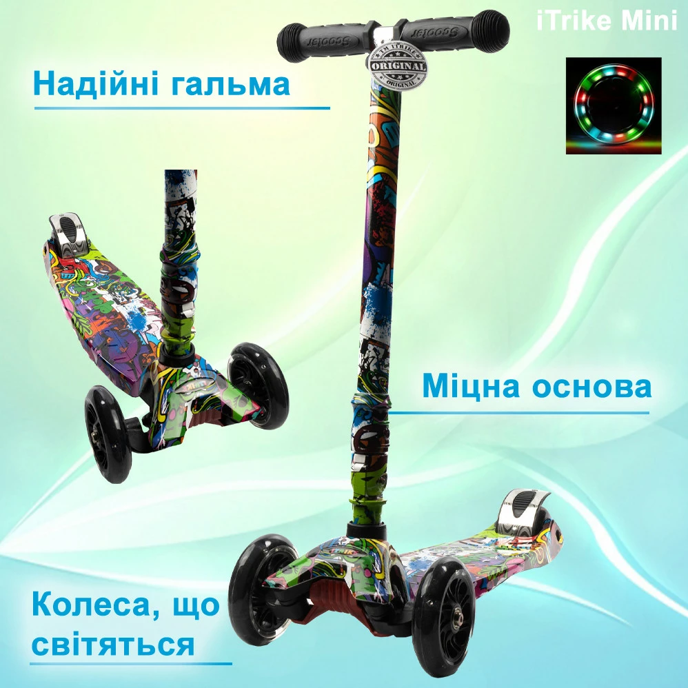 Самокат дитячий триколісний iTrike MAXI Самокат JR 3-055-WP7 кермо 66-89см, колеса ПУ з підсвічуванням, Чорний