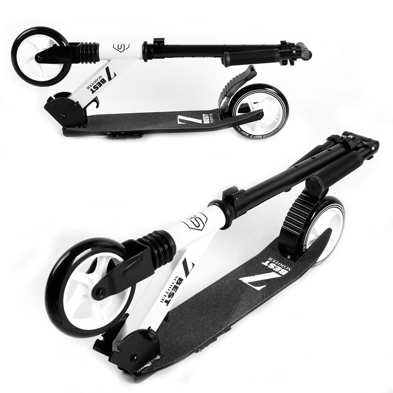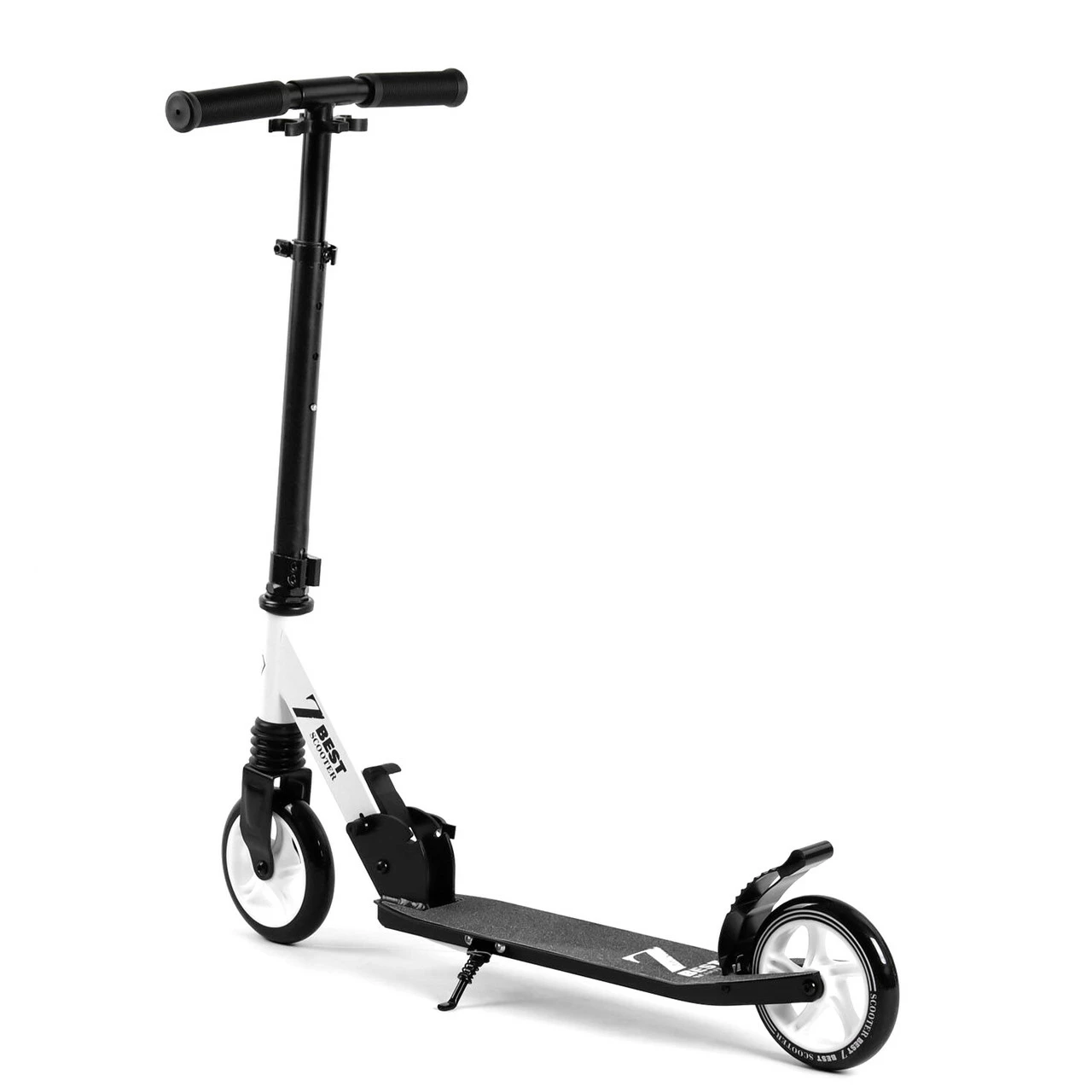 Самокат имеет передний амортизатор, алюминиевую прочную основу