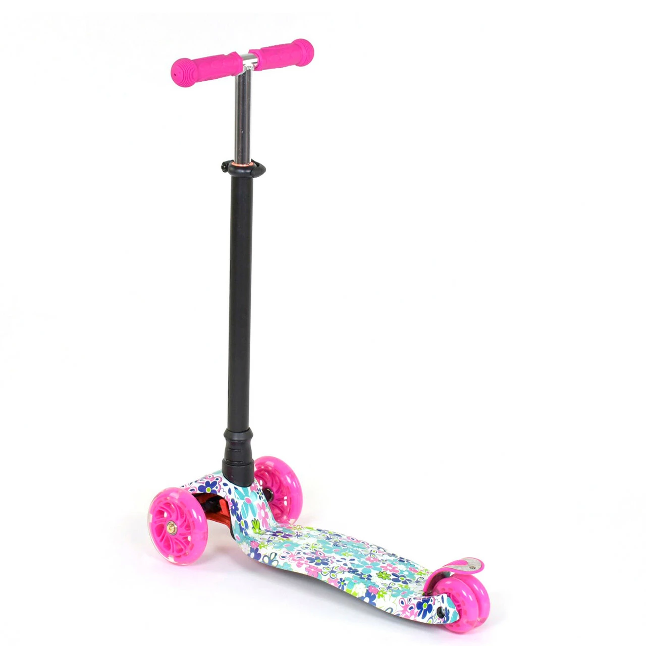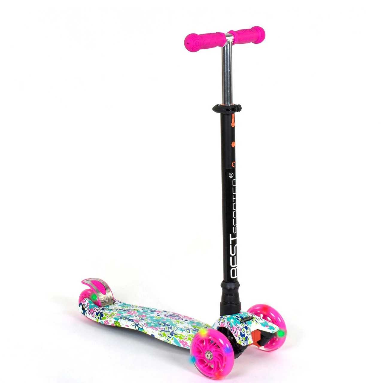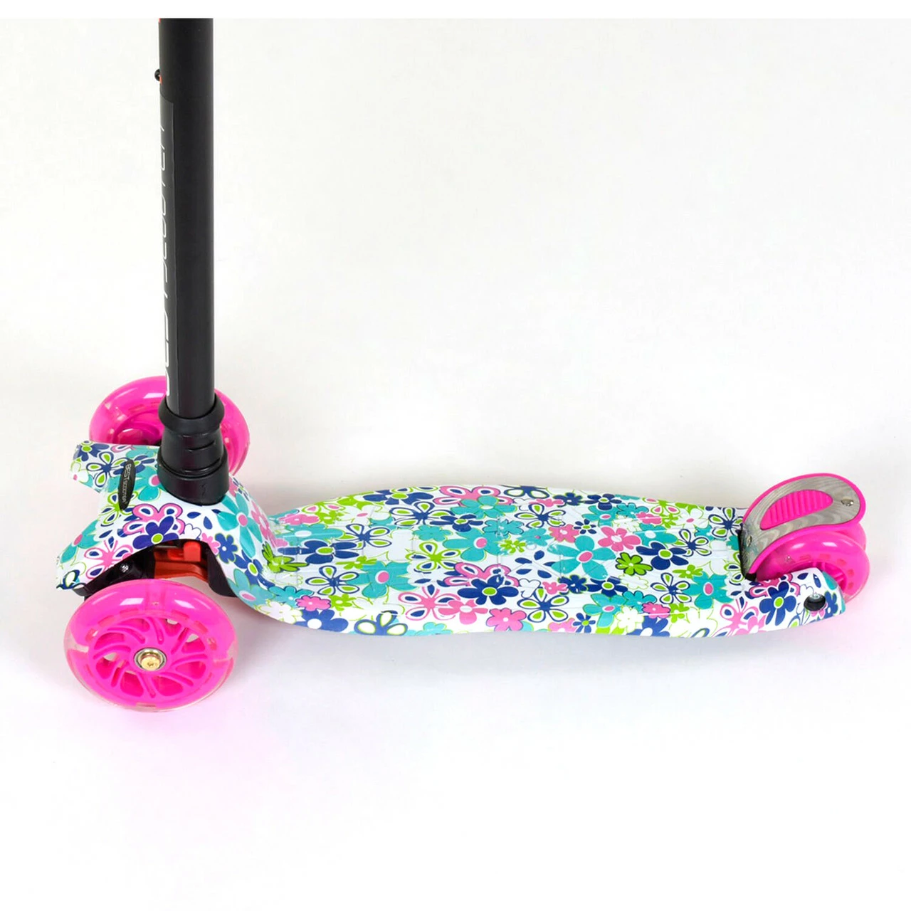 Самокат со светящимися колесами от Scooter предназначен для маленьких любителей активного отдыха. Яркий дизайн данной модели с первого взгляда привлечет внимание малыша и станет любимым транспортным средством! За счет трехколесной конструкции и сдвоенному заднему колесу самокат достаточно устойчив и предотвращает падения во время катания. Пластмассовая дека самоката выполнена из прочного материала и крепится на раму. Т-образный руль имеет прочное металлическое основание. Высота руля фиксируется в 3х положениях. Фигурные грипсы выполнены из резины с рельефными узорами, которые предотвращают соскальзывание ладони с руля во время катания. Наклонная система поворота руля обеспечивает максимально легкое и безопасное управления самокатом. Особенности модели: