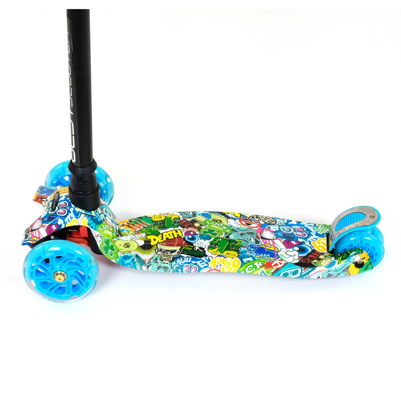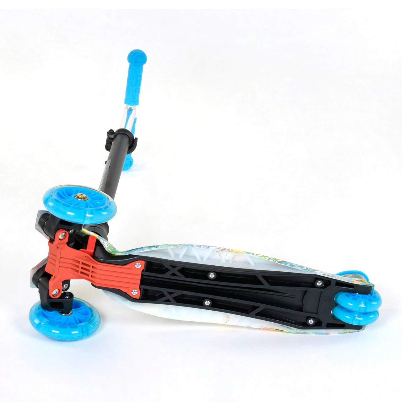 Самокат со светящимися колесами, предназначен для маленьких любителей активного отдыха. Яркий дизайн данной модели с первого взгляда привлечет внимание малыша и станет любимым транспортным средством. За счет трехколесной конструкции и сдвоенному заднему колесу самокат достаточно устойчив и предотвращает падения во время катания. Пластмассовая дека самоката выполнена из прочного материала и крепится на раму. Т-образный руль имеет прочное металлическое основание. Высота руля фиксируется в 3х положениях. Фигурные грипсы выполнены из резины с рельефными узорами, которые предотвращают соскальзывание ладони с руля во время катания. Наклонная система поворота руля обеспечивает максимально легкое и безопасное управления самокатом. Особенности модели: