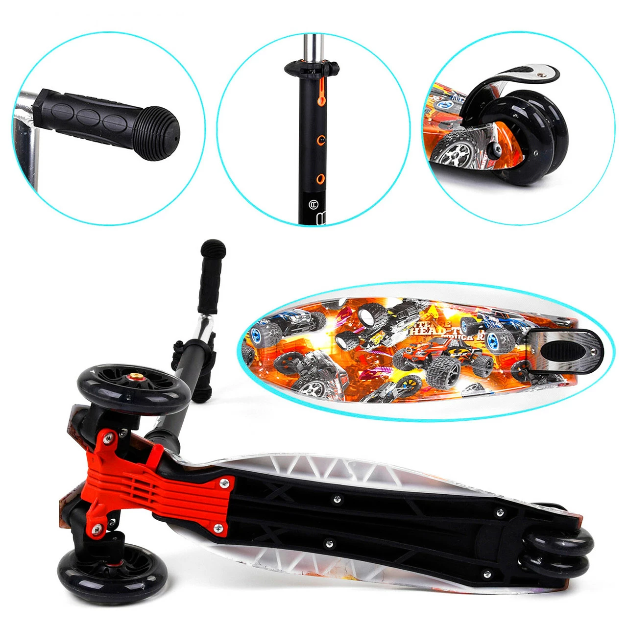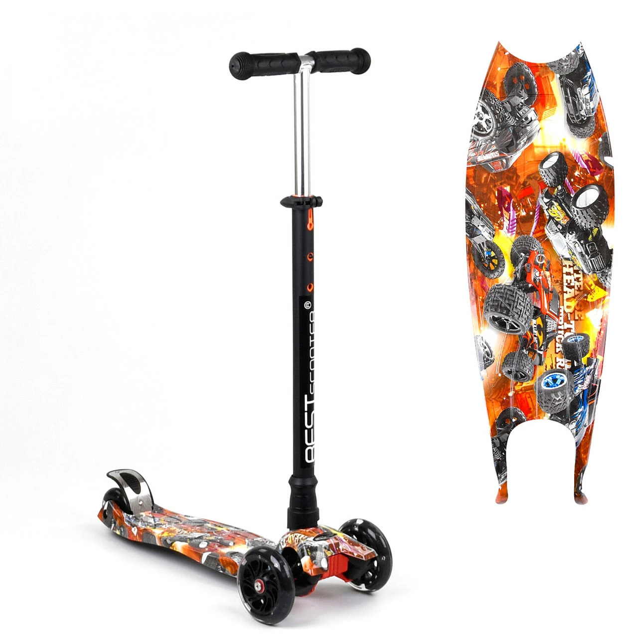 Самокат со светящимися колесами, предназначен для маленьких любителей активного отдыха. Яркий дизайн данной модели с первого взгляда привлечет внимание малыша и станет любимым транспортным средством. За счет трехколесной конструкции и сдвоенному заднему колесу самокат достаточно устойчив и предотвращает падения во время катания. Пластмассовая дека самоката выполнена из прочного материала и крепится на раму. Т-образный руль имеет прочное металлическое основание. Высота руля фиксируется в 3х положениях. Фигурные грипсы выполнены из резины с рельефными узорами, которые предотвращают соскальзывание ладони с руля во время катания. Наклонная система поворота руля обеспечивает максимально легкое и безопасное управления самокатом. Особенности модели:
