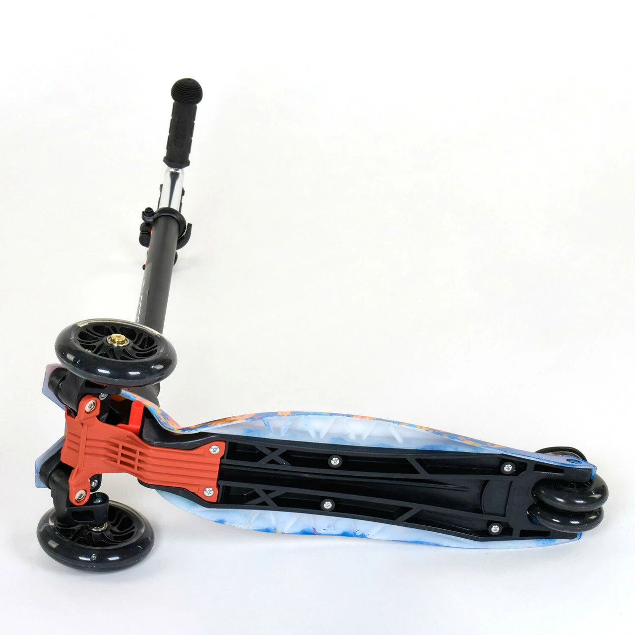 Самокат со светящимися колесами, предназначен для маленьких любителей активного отдыха. Яркий дизайн данной модели с первого взгляда привлечет внимание малыша и станет любимым транспортным средством. За счет трехколесной конструкции и сдвоенному заднему колесу самокат достаточно устойчив и предотвращает падения во время катания. Пластмассовая дека самоката выполнена из прочного материала и крепится на раму. Т-образный руль имеет прочное металлическое основание. Высота руля фиксируется в 3х положениях. Фигурные грипсы выполнены из резины с рельефными узорами, которые предотвращают соскальзывание ладони с руля во время катания. Наклонная система поворота руля обеспечивает максимально легкое и безопасное управления самокатом. Особенности модели: