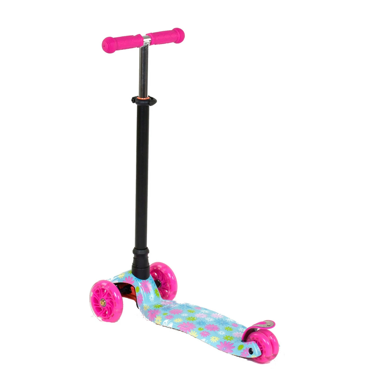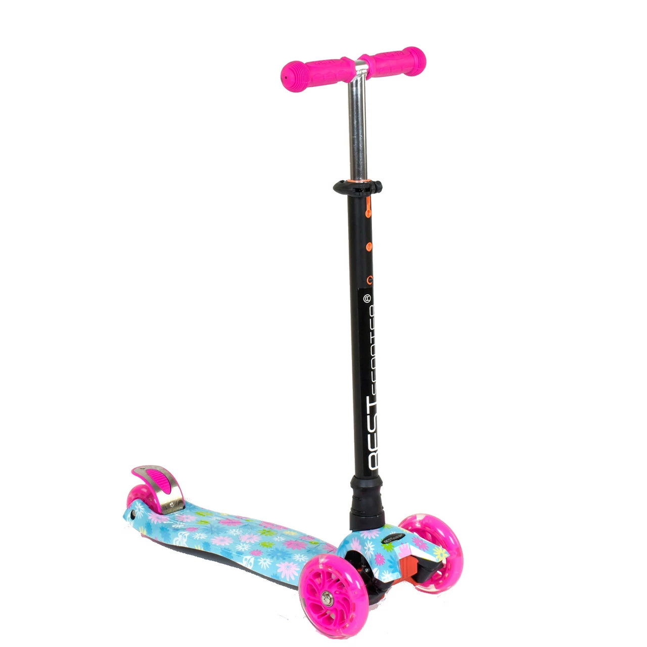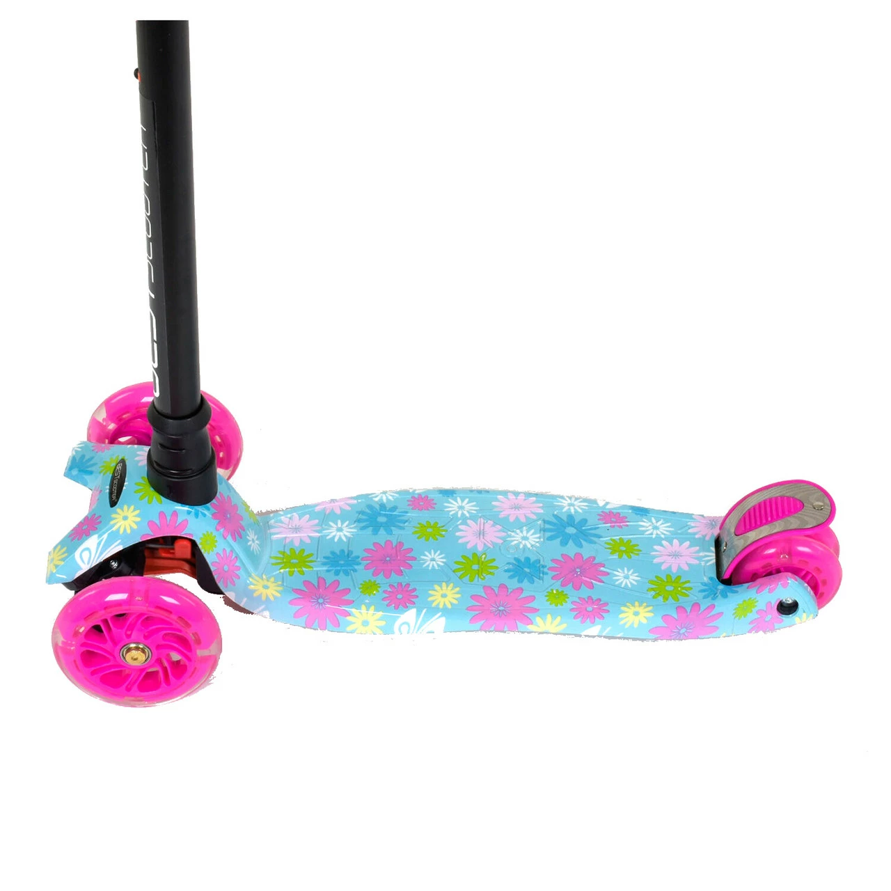 Самокат со светящимися колесами, предназначен для маленьких любителей активного отдыха. Яркий дизайн данной модели с первого взгляда привлечет внимание малыша и станет любимым транспортным средством. За счет трехколесной конструкции и сдвоенному заднему колесу самокат достаточно устойчив и предотвращает падения во время катания. Пластмассовая дека самоката выполнена из прочного материала и крепится на раму. Т-образный руль имеет прочное металлическое основание. Высота руля фиксируется в 3х положениях. Фигурные грипсы выполнены из резины с рельефными узорами, которые предотвращают соскальзывание ладони с руля во время катания. Наклонная система поворота руля обеспечивает максимально легкое и безопасное управления самокатом. Особенности модели: