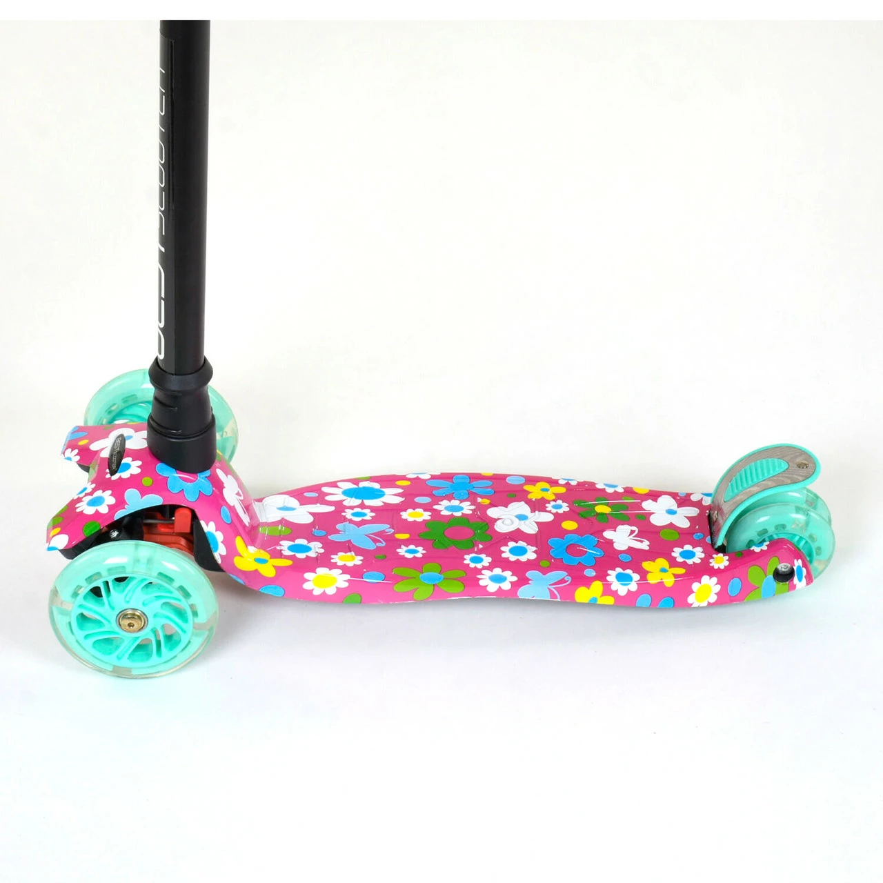 Самокат со светящимися колесами, предназначен для маленьких любителей активного отдыха. Яркий дизайн данной модели с первого взгляда привлечет внимание малыша и станет любимым транспортным средством. За счет трехколесной конструкции и сдвоенному заднему колесу самокат достаточно устойчив и предотвращает падения во время катания. Пластмассовая дека самоката выполнена из прочного материала и крепится на раму. Т-образный руль имеет прочное металлическое основание. Высота руля фиксируется в 3х положениях. Фигурные грипсы выполнены из резины с рельефными узорами, которые предотвращают соскальзывание ладони с руля во время катания. Наклонная система поворота руля обеспечивает максимально легкое и безопасное управления самокатом. Особенности модели:
