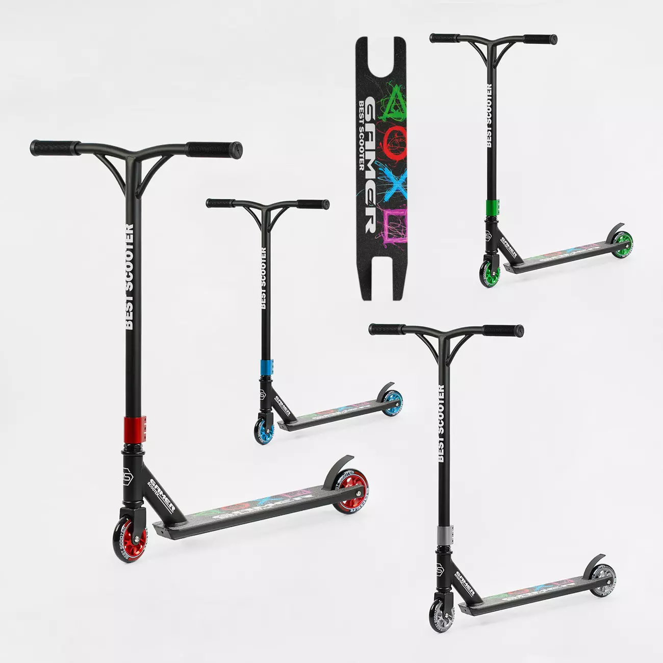 Самокат трюковий Best Scooter BS-90277 - це новинка для досвідчених райдерів і початківців! Цей самокат належить до типу трюкових і має низку відмінностей від звичайних у конструкції, матеріалах і розмірах. 1. Конструкція максимально спрощена. Рульовий хомут з трьома болтами надійно фіксує рульову стійку самоката з його рамою. 2. Рама цього самоката посилена і виконана з алюмінію, а в місцях з'єднання основних елементів видніються зварні шви. 3. Колеса моделі, як і належить трюковому самокату, маленькі в діаметрі (всього 10 см) з великою жорсткістю, також виконані з алюмінію. 4. Підшипник типу ABEC 7 робить самокат по-справжньому швидкісним і зручним для розгону під час виконання трюків. 5. Досить довга вузька дека покрита спеціальною шкуркою, яка забезпечить краще зчеплення ноги райдера з нею. 6. Накладки на кермо, іншими словами грипси, у цього самоката виконані з міцного нековзного матеріалу. Матеріали: Конструкція - 50% високоміцний алюміній, 50% сталь; Колеса - PU (поліуретан); Диски коліс - високоміцний алюміній; Ручки - гума. Розміри: Висота керма від підлоги - 85 см, від деки - 77,5 см, ширина керма - 50,5 см; Дека - 48 х 10 см; Діаметр колеса - d = 10 см, ширина - 3 см. Максимальне навантаження: 80 кг.