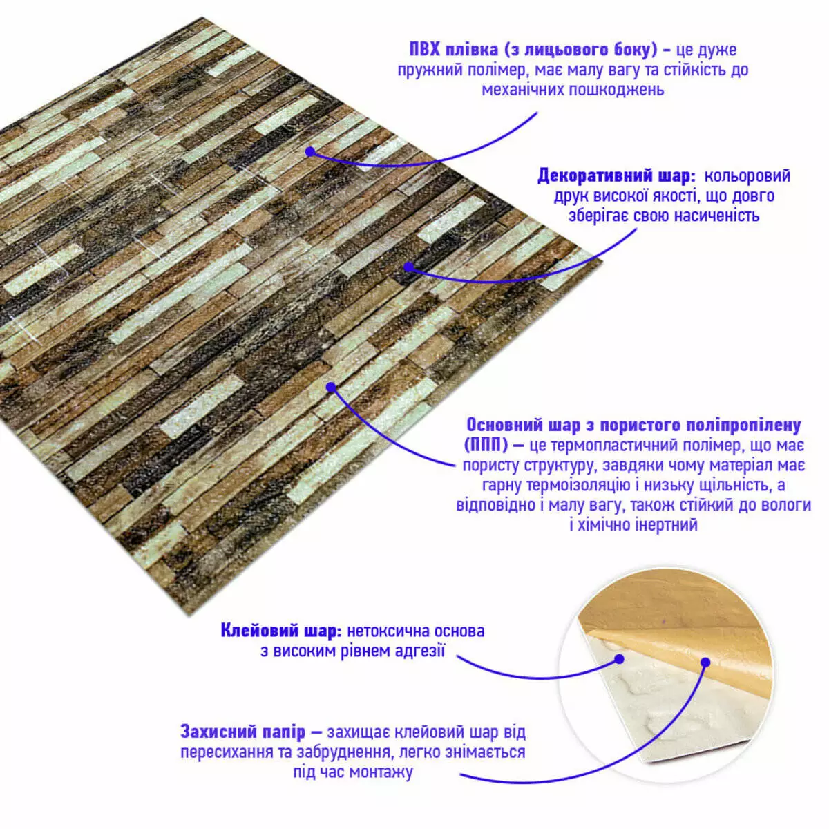 5. Захисний папір – оберігає клейовий шар від пересихання та забруднення, легко знімається під час монтажу.