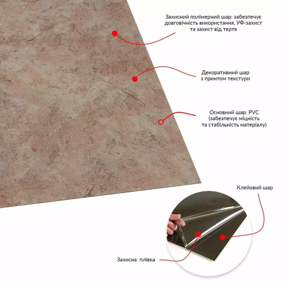 - Основний шар: складається із ПВХ та забезпечує