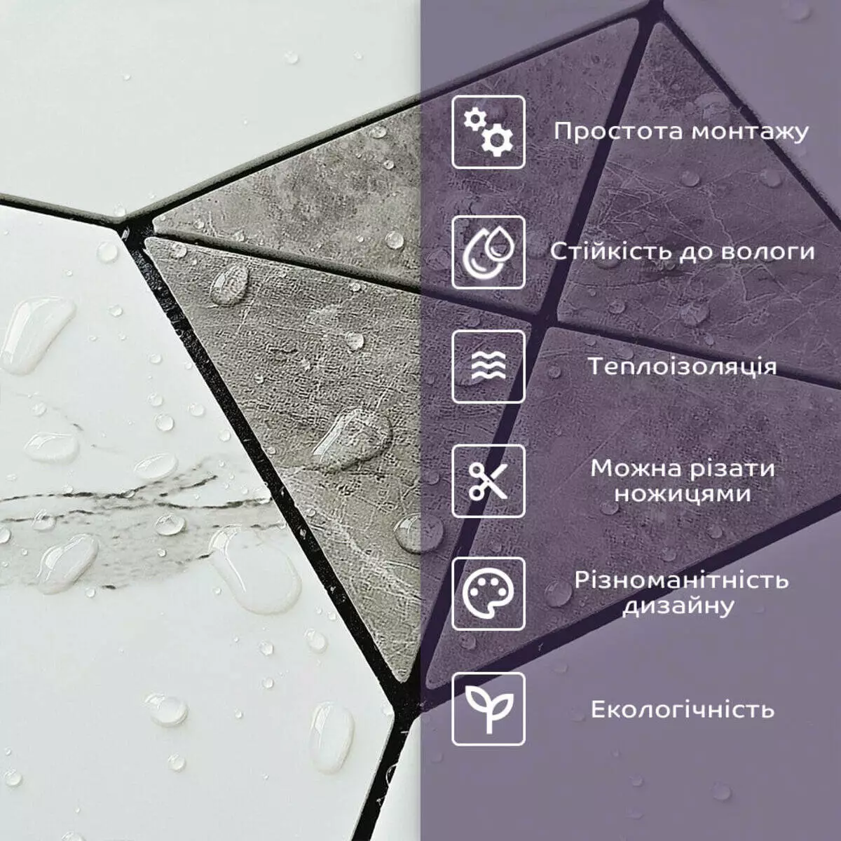 • Стійкість до вологи: матеріал стійкий до впливу вологи та пари, а також до появи плісняви, що робить його придатним для використання у приміщеннях з високою вологістю, таких як ванни та кухні. Плитка підходить для створення фартуха кухні, можна клеїти біля плити на відстані не менше ніж 20-25 см;