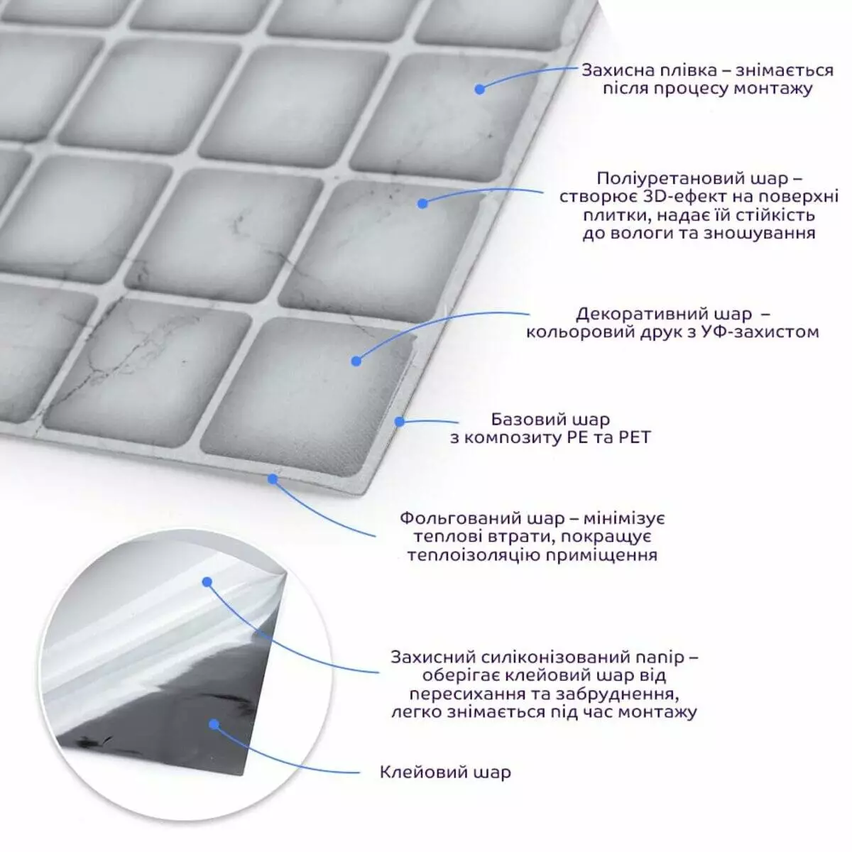 • Захисна плівка: зберігає поліуретанову поверхню від подряпин, відколів та інших механічних пошкоджень у процесі транспортування. Після проведення монтажу плівка знімається з поверхні плитки.