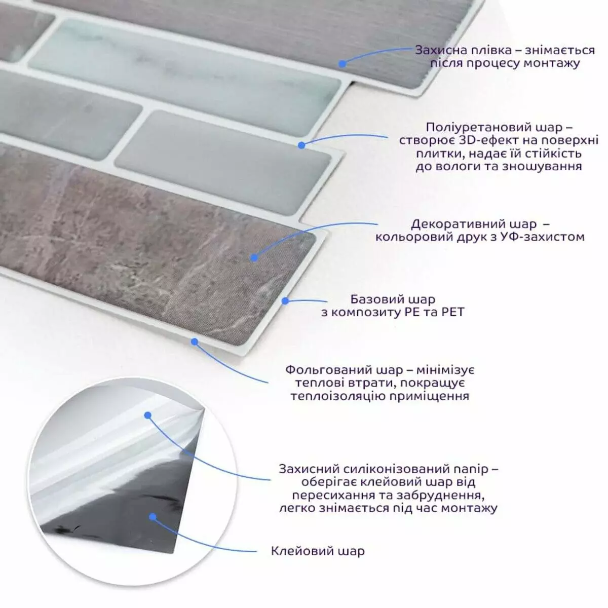 • Захисний силіконізований папір: зберігає клейовий шар від пересихання та забруднення, легко знімається під час монтажу.