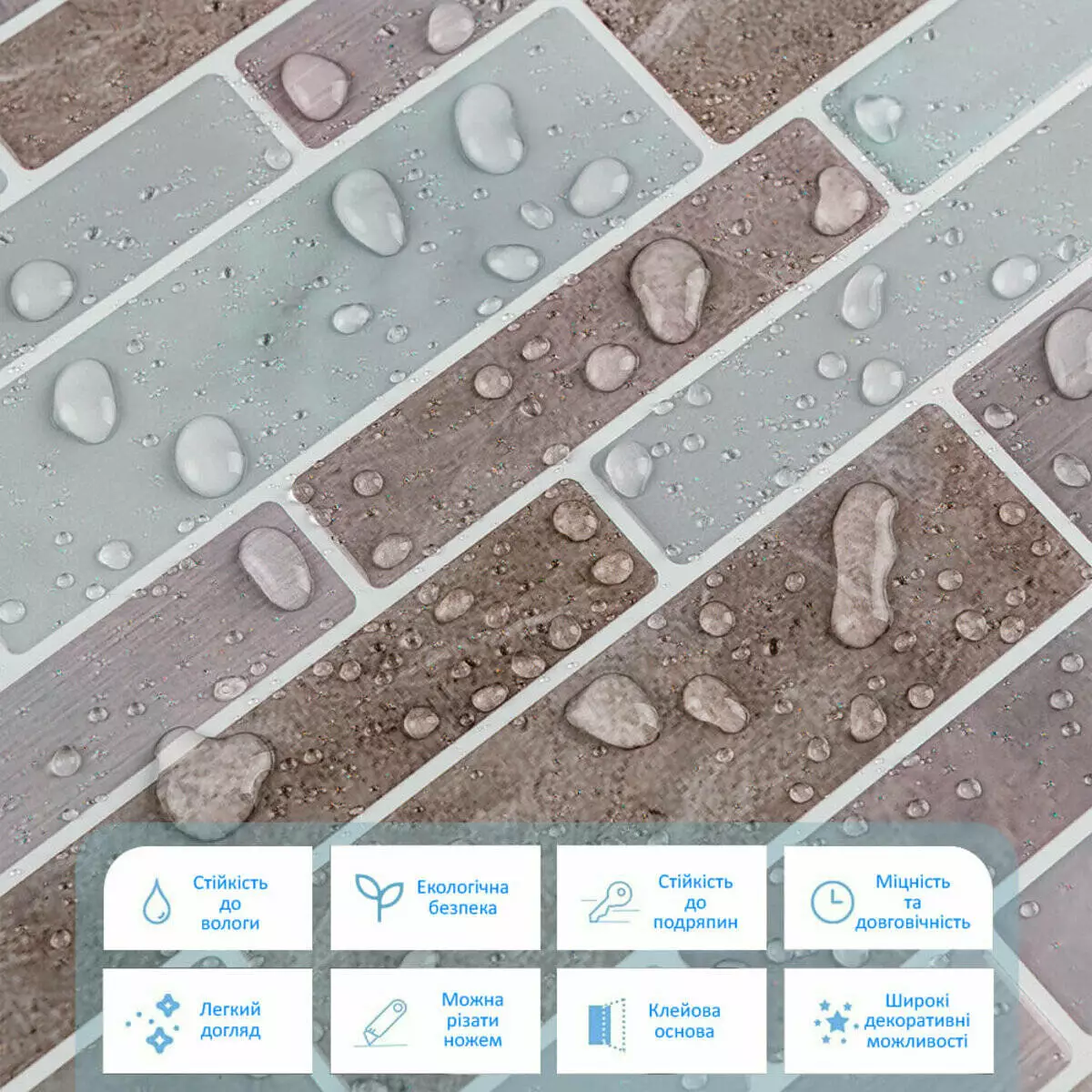 • Декоративний шар: кольоровий друк високої роздільної здатності, що імітує фактуру керамічної плитки та частково природних матеріалів, завдяки чіткому та детальному зображенню, а УФ-захист допомагає запобігти вигорянню, зберігаючи колір насиченим.