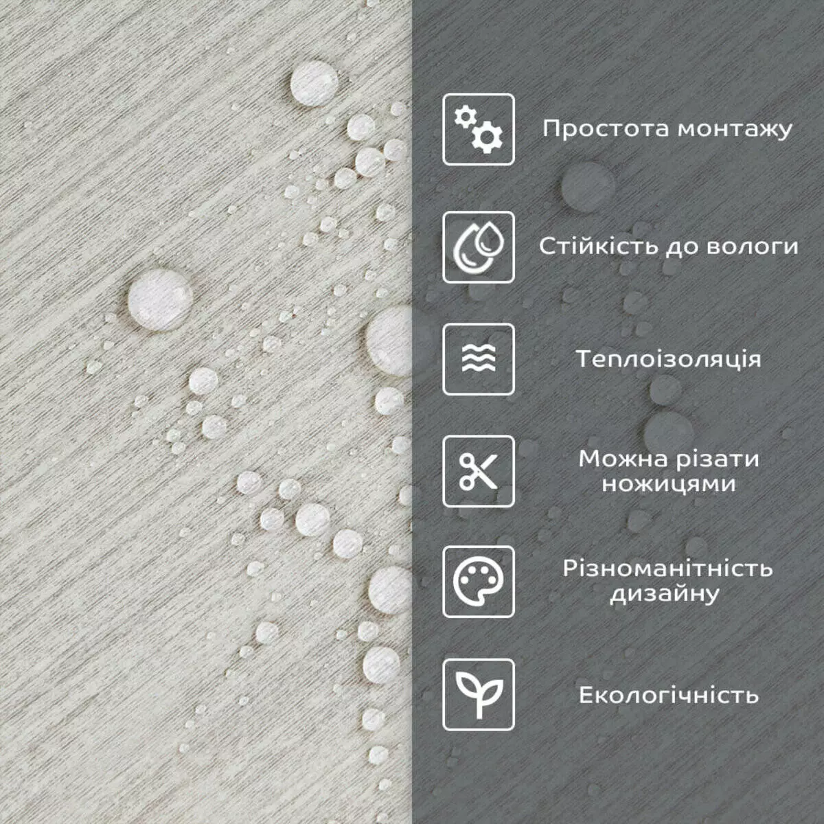 - 2. Стійкість до вологи: матеріал стійкий до впливу вологи та