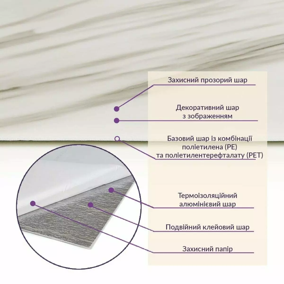 • Базовий шар з комбинації поліетилена (PE) і поліетилентерефталату (PET)