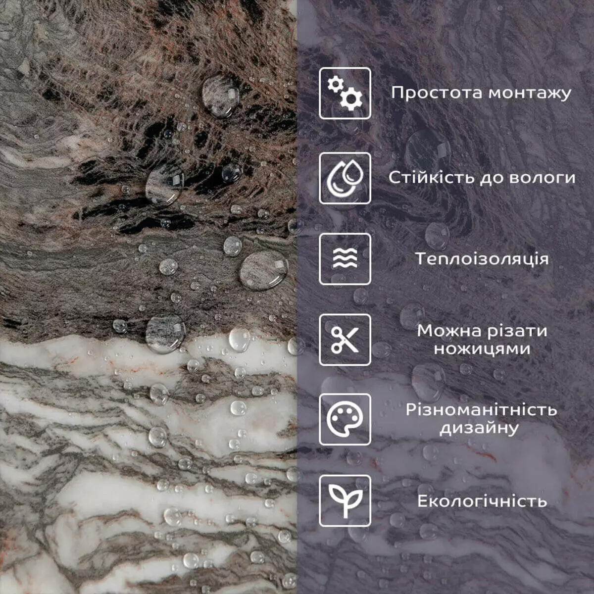 • 2. Стійкість до вологи: матеріал стійкий до впливу вологи та пари, а також до появи плісняви, що робить його придатним для використання у приміщеннях з високою вологістю, таких як ванни та кухні. Плитка підходить для створення фартуха кухні, можна клеїти біля плити на відстані не менше ніж 20-25 см;