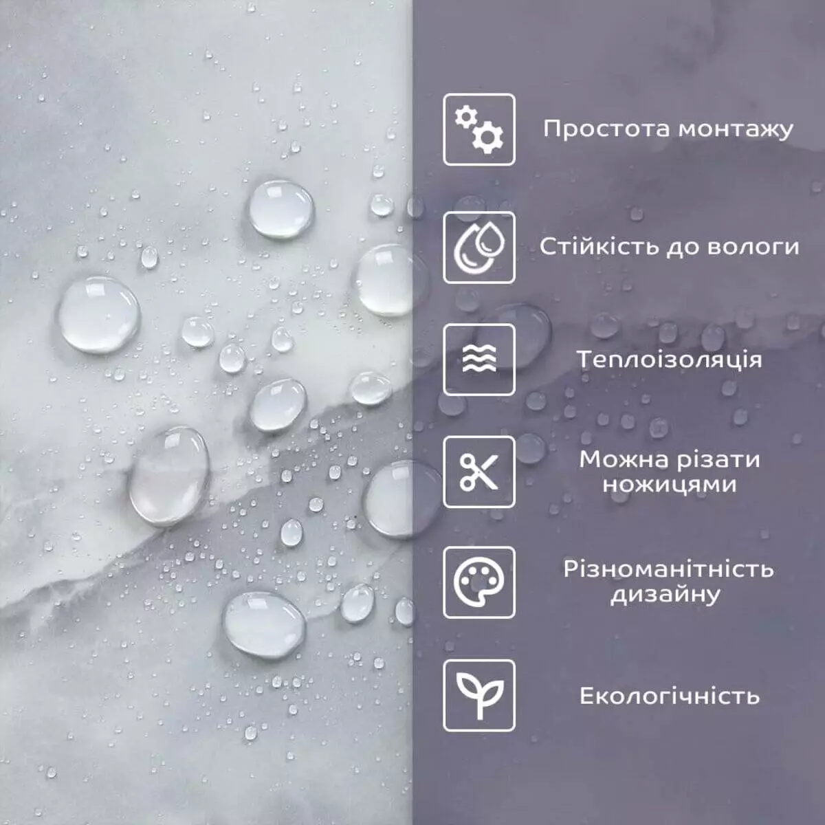 • 2. Стійкість до вологи: матеріал стійкий до впливу вологи та пари, а також до появи плісняви, що робить його придатним для використання у приміщеннях з високою вологістю, таких як ванни та кухні. Плитка підходить для створення фартуха кухні, можна клеїти біля плити на відстані не менше ніж 20-25 см;