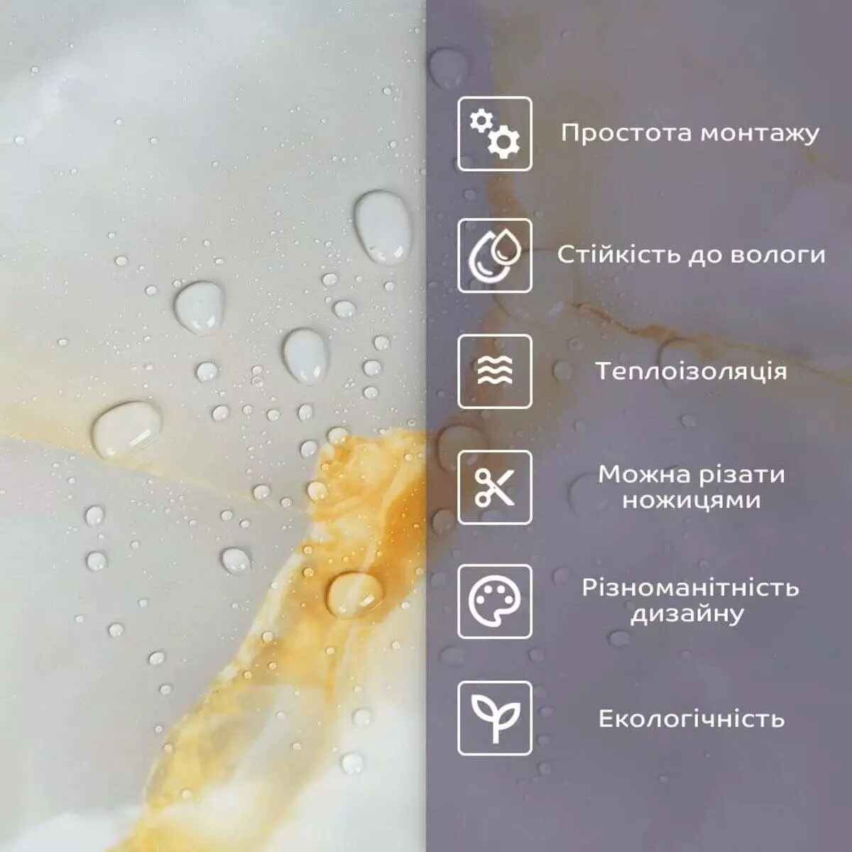 • 2. Стійкість до вологи: матеріал стійкий до впливу вологи та пари, а також до появи плісняви, що робить його придатним для використання у приміщеннях з високою вологістю, таких як ванни та кухні. Плитка підходить для створення фартуха кухні, можна клеїти біля плити на відстані не менше ніж 20-25 см;