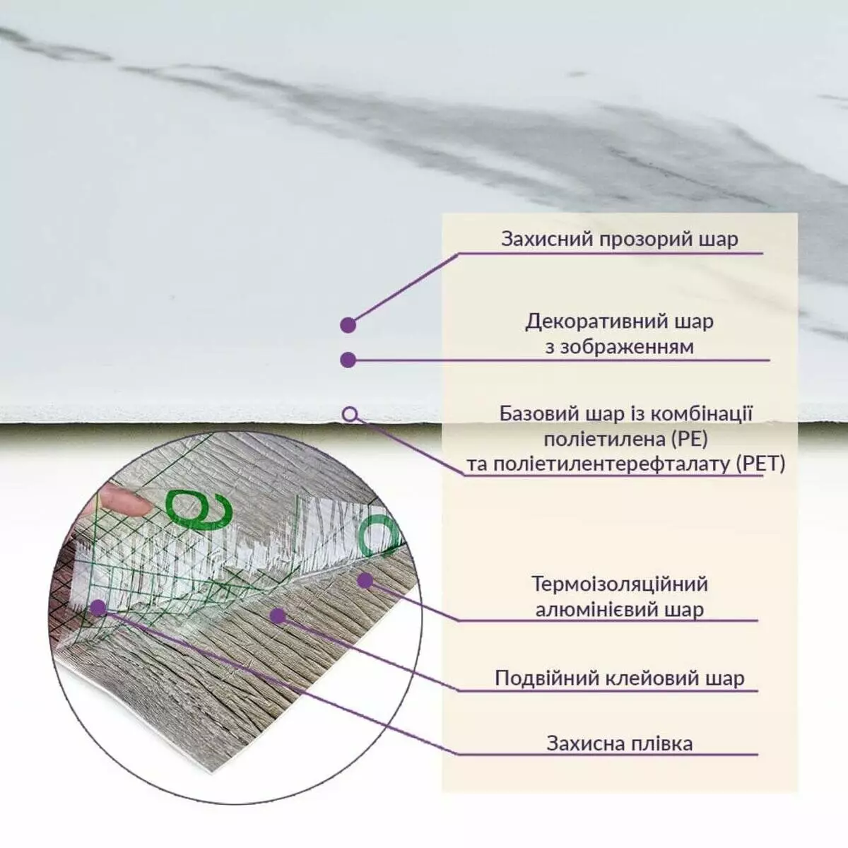 • Базовий шар з комбинації поліетилена (PE) і поліетилентерефталату (PET)
