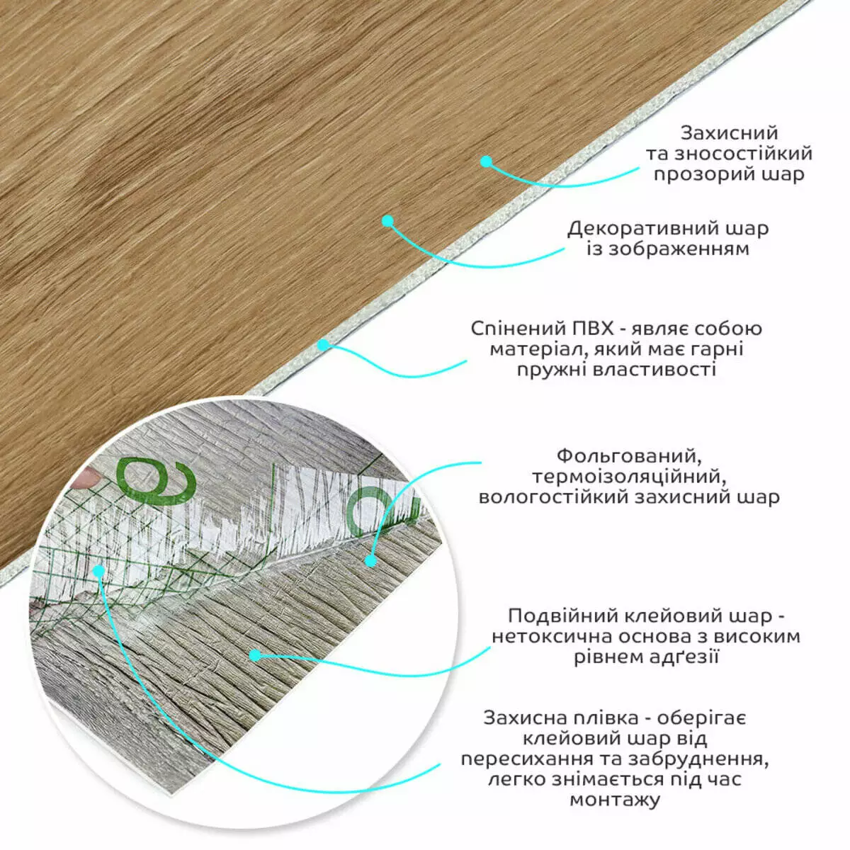 • Основний шар із спіненого полівінілхлориду (ПВХ) – це полімер, що складається з довгих ланцюгів молекул вінілхлориду, в яких містяться атоми хлору, це надає матеріалу стійкість до дії хімічних речовин. ПВХ є аморфним полімером, така особливість будови робить його пружним та ударостійким, а завдяки стабілізаторам та пом'якшувачам, матеріал має малу вагу.