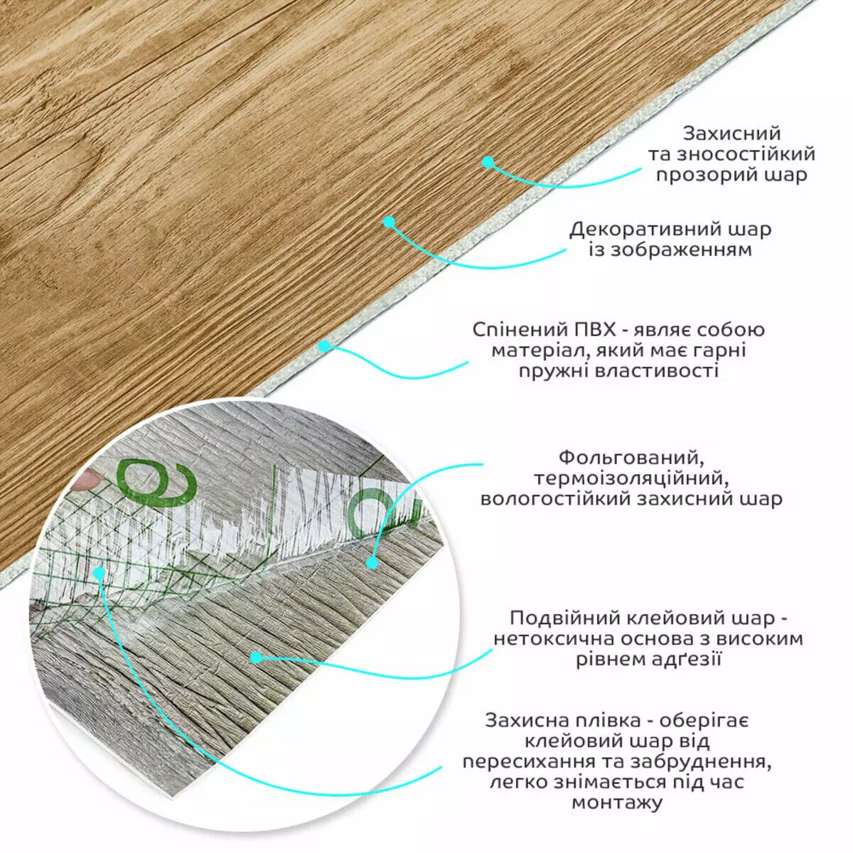 • Захисна плівка – оберігає клейовий шар від пересихання та забруднення, легко знімається під час монтажу.