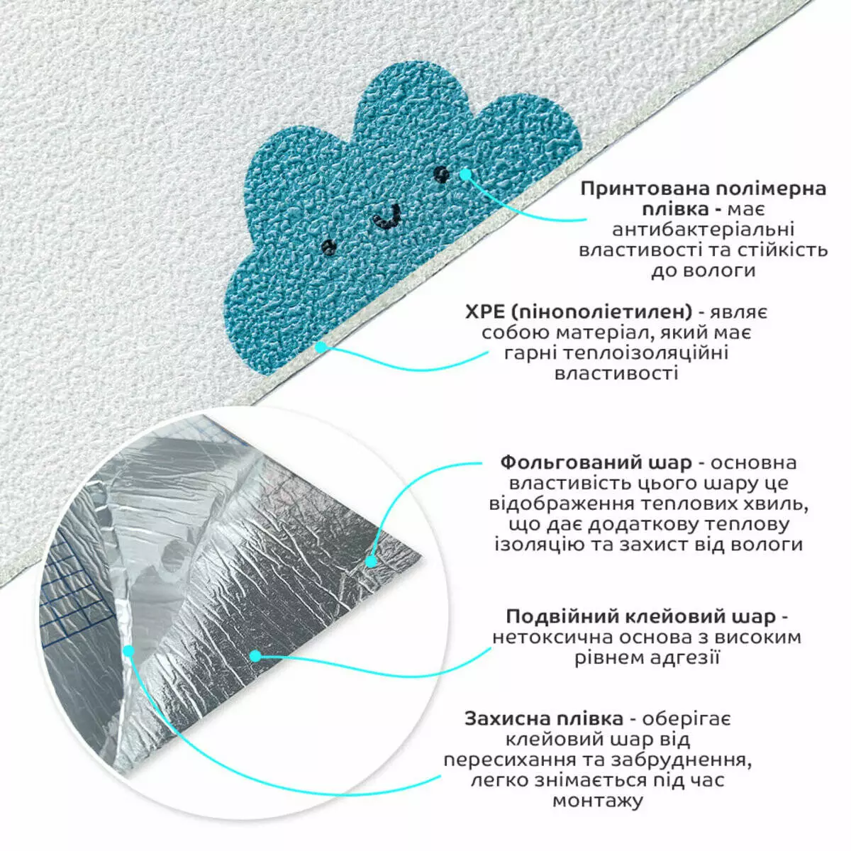 - Теплоізоляція: Спінений ХРЕ і фольгований шар