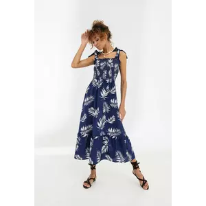 Сарафан довгий з панельної тканини, з принтом листя, підходить як для повсякденного носіння, так і для пляжного відпочинку Верхня частина сарафану, виконана широкою резинкою, не даючи сарафану сповзти з тіла, є зав'язки, спідниця сарафана вільна, з оборкою по низу