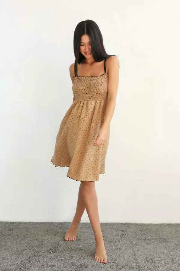 Ніжний відтінок з контрастним чорним горошком додає сарафану елегантного вигляду та легкого ретро-шарму. Горошок — це вічний принт, який надає образу грайливості та витонченості, а в поєднанні з м'яким коричневим кольором цей дизайн виглядає сучасно та стильно. Такий відтінок є універсальним і підходить для будь-якого типу зовнішності, додаючи образу ніжності й водночас роблячи його яскравим та привабливим.