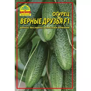 Верные друзья – скороспелый гибрид. Рекомендуется к использованию на садово-огородных участках, приусадебных хозяйствах. Пчелоопыляемый, c пучковым формированием плодов. Предназначен для выращивания в открытом грунте и весенних пленочных теплицах. Период от появления всходов до сбора первых плодов 37 – 39 дней. Преимущественно женского типа цветения. В одной листовой пазухе формируется до 5 - 8 завязей и более. Плотность посадки в теплице - 3 раст./кв.м, в открытом грунте 4 - 5 раст./кв.м. Зеленцы овально-цилиндрической формы, с крупными бугорками, длиной 8 – 10 см, диаметром 3,5 - 4 см, массой 90 - 110 г. Мякоть без горечи. В открытом грунте урожайность составляет 2,5 - 3 кг/кв.м. Сорт универсальный. Вкусовые качества свежих и консервированных плодов хорошие. Огурец Верные друзья характеризуется холодостойкостью. Устойчив к бурой пятнистости (кладоспориоз) и вирусу обыкновенной мозаики огурца, к мучнистой росе. Схема посадки 50*50 см
