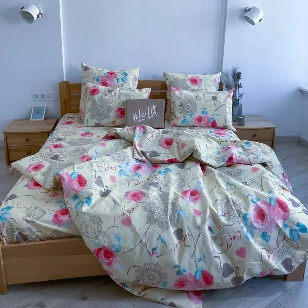 Семейное постельное белье LeLIT 0023 молочное с нежно-розовыми и голубыми цветами