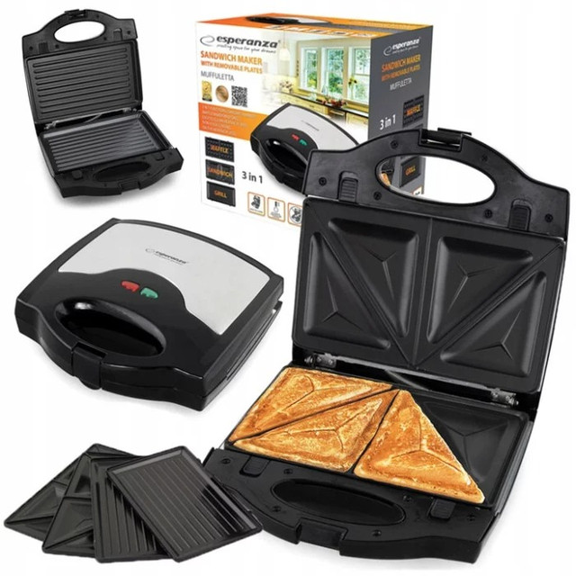 Бутербродниця має компактні розміри, простий дизайн і зручність в експлуатації. Потужність приладу становить 700 Вт. Завдяки спеціальним знімним панелям, якими комплектується Esperanza EKT005, Ви можете потішити себе та близьких смачними ароматними сендвічами або хрусткими вафлями, а також скористатися функцією гриля.
