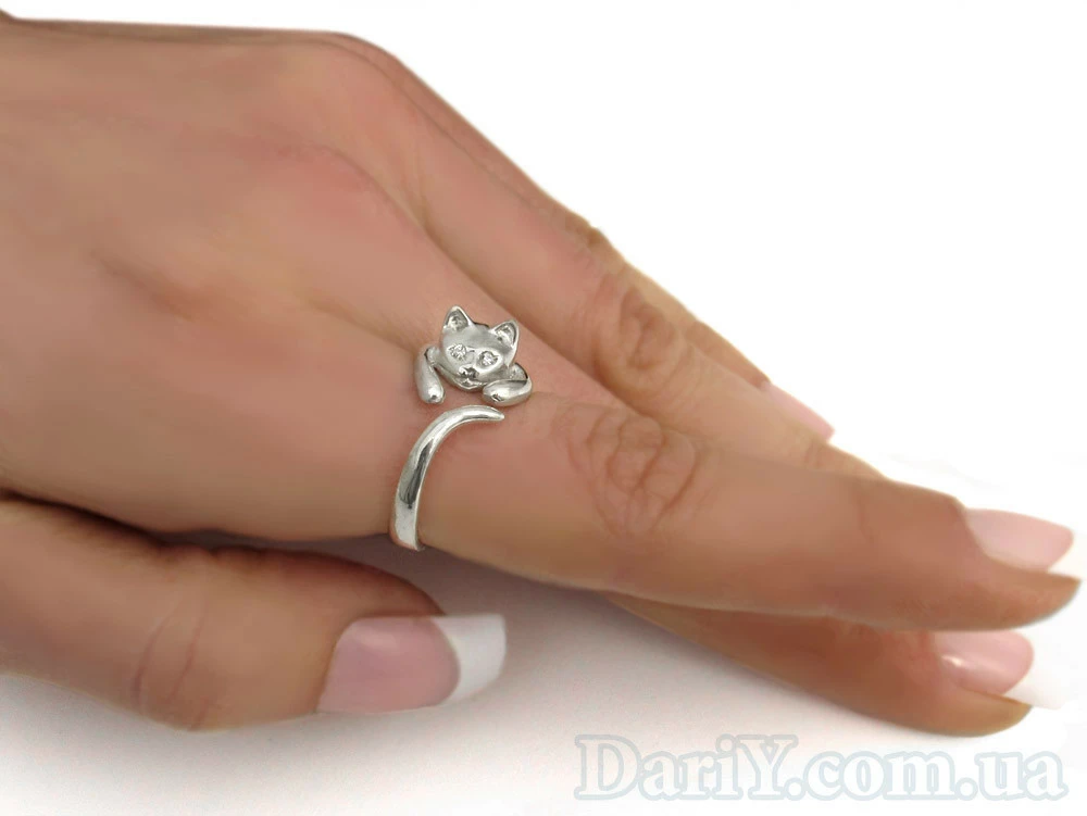 Кольцо в виде кошки из серебра с фианитовыми вставками.