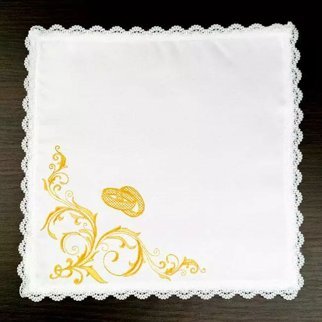 Серветка на красивим білому полотні, малюнок вишитий гладдю золотистими нитками. Серветка прикрашена ніжним мереживом. Розмір 25*25см. Можна використовувати як серветку під весільні кільця і свічки.