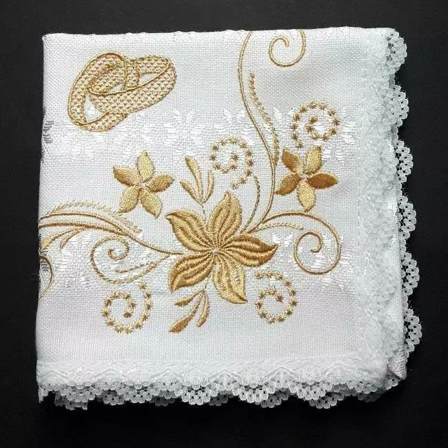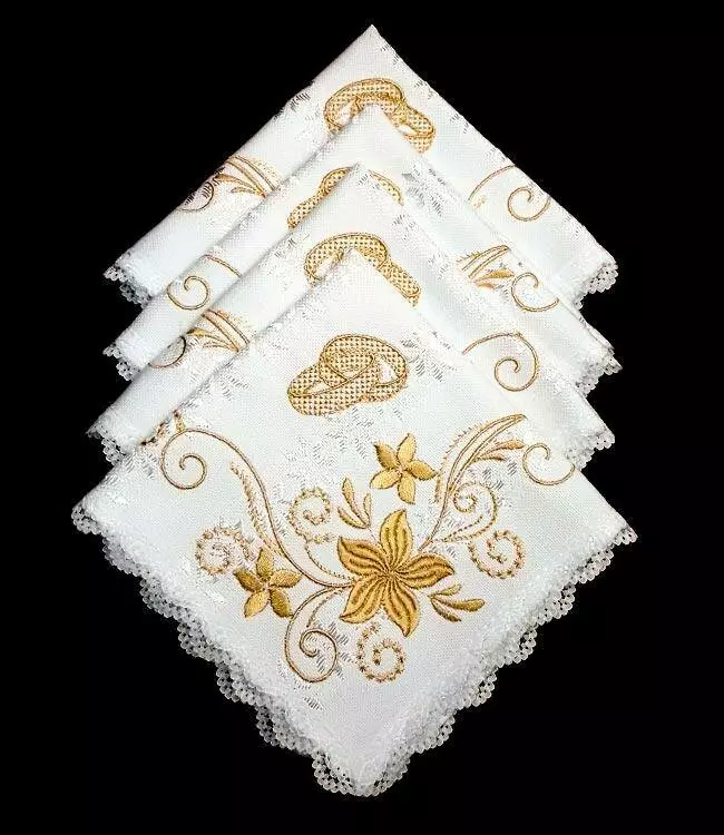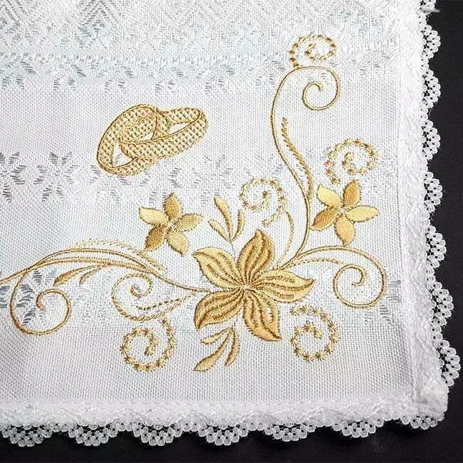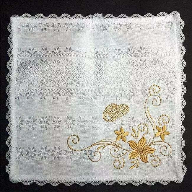 Серветка на білому полотні з білим тканим орнаментом, малюнок вишитий гладдю золотистими нитками.