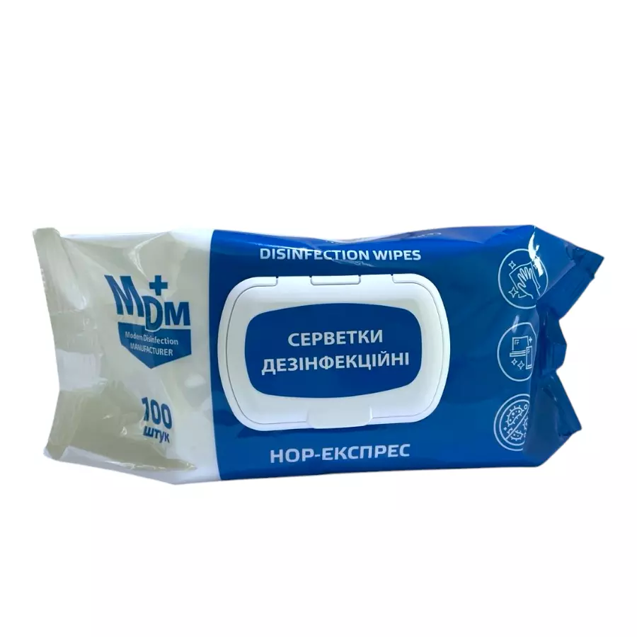 Серветки дезінфекційні «НОР-експрес» — це готові до застосування серветки швидкої дії, просочені спиртовим антисептиком на основі ізопропілового спирту та четвертинної амонієвої сполуки. Засіб забезпечує виражену бактерицидну, віруліцидну, фунгіцидну та туберкулоцидну дію, має пролонгований антимікробний ефект до 3 годин. Серветки не фіксують білкових забруднень, не пошкоджують поверхні, не залишають нальоту, сумісні з медичним обладнанням і безпечні для обробки шкіри рук, шкірних покривів та різноманітних поверхонь.