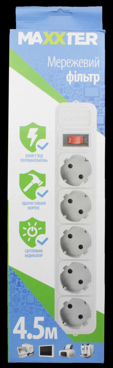 Сетевой фильтр Maxxter SPM5-G-15G 5 гнёзд, 4.5 метра