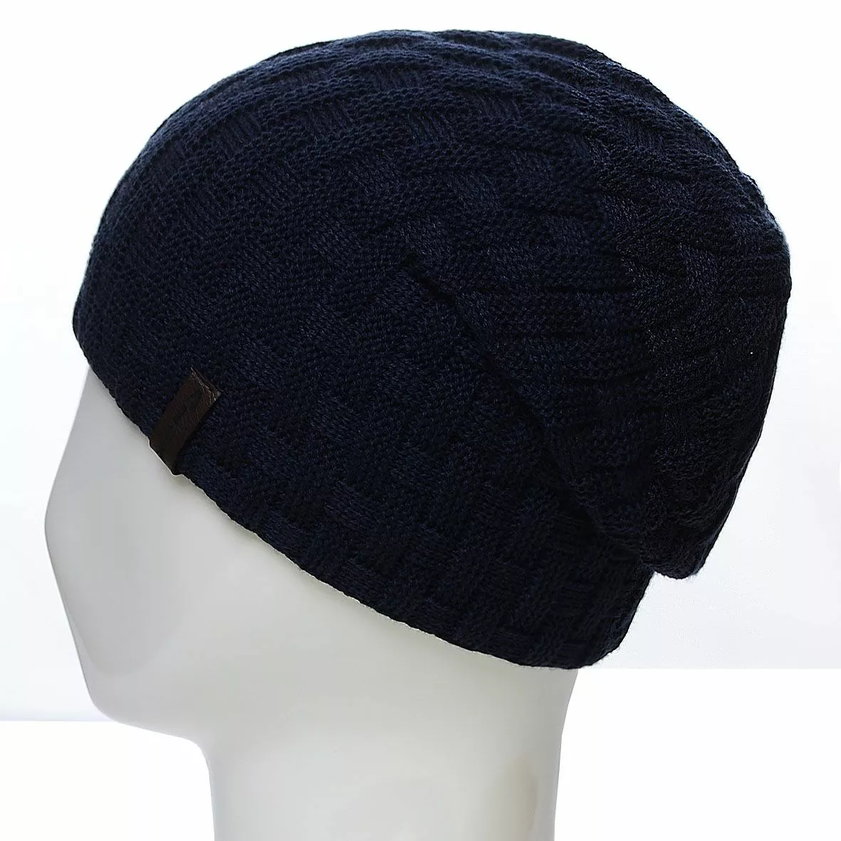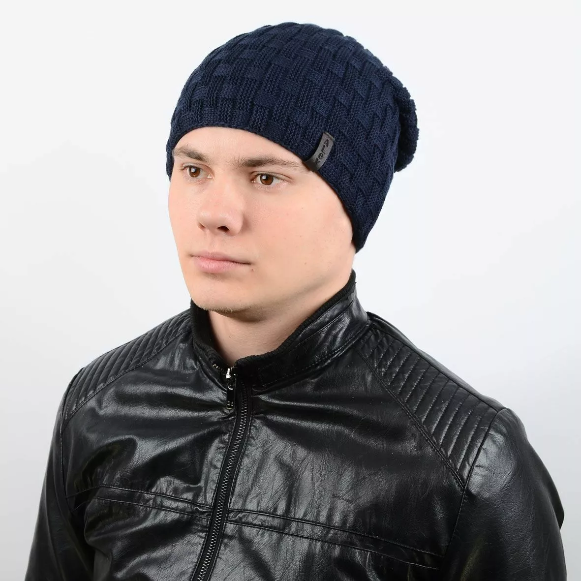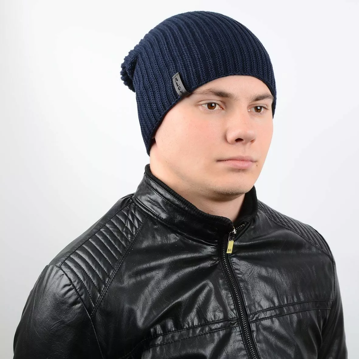 Мужская двусторонняя шапка-чулок - будет надёжно защищать вас от любой непогоды, а современный и стильный дизайн будет замечательно сочетается с любой верхней одеждой. Такое изделие можно надевать на пробежку в холодное время года, для занятий активным видом спорта, а также просто носить с повседневной одеждой. Модель имеет два разных вида вязки, декором выступает кожаная лейба "Alex".