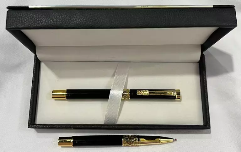 Элегантная шариковая ручка в классическом исполнении — корпус глубокого черного цвета с изысканными золотыми элементами. Она станет незаменимым аксессуаром для офиса, переговоров и деловой переписки.
