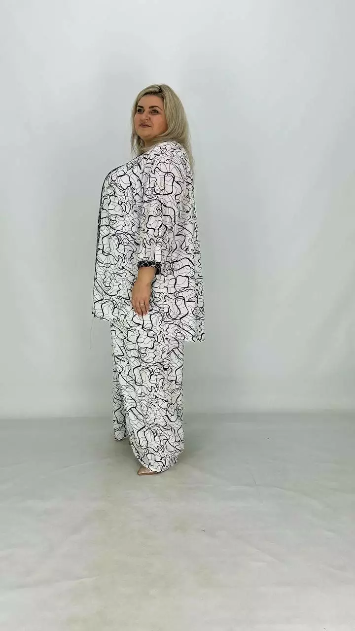 Штани та накидка з тканини супер софт: дуже легка, м'яка, не жарка і не мнеться, тканина не тягнеться.