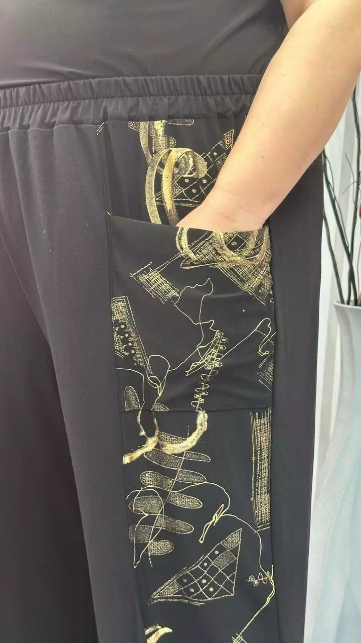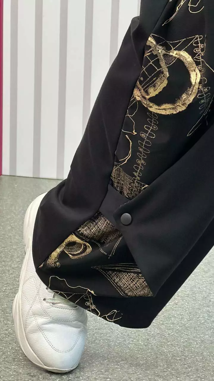 пояс на гумці. По низу брюк відлітна частина кріпиться на кнопці.