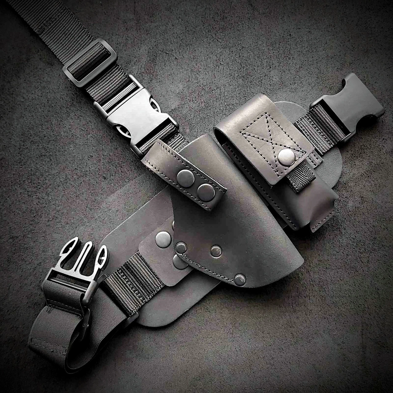 Кобура на стегно під ТТ. Колір чорний Виконана із натуральної шкіри. Кобура та паучер зі шкіри завтовшки 2.5 мм, підкладка з ремінної шкіри 3.5 мм завтовшки. Кобура та паучер знімні, можна носити на ремені. Кріплення на ремінь 5 см завширшки. Підкладка фіксується на стропі зверху та на гумці збоку. Стропа, гумка, фастекси міцні. Ширина фастексів 4 см Підкладка регулюється по вертикалі та горизонталі. Кобура не бовтається, сидить щільно. Виробництво Україна, робимо під праву та ліву руку