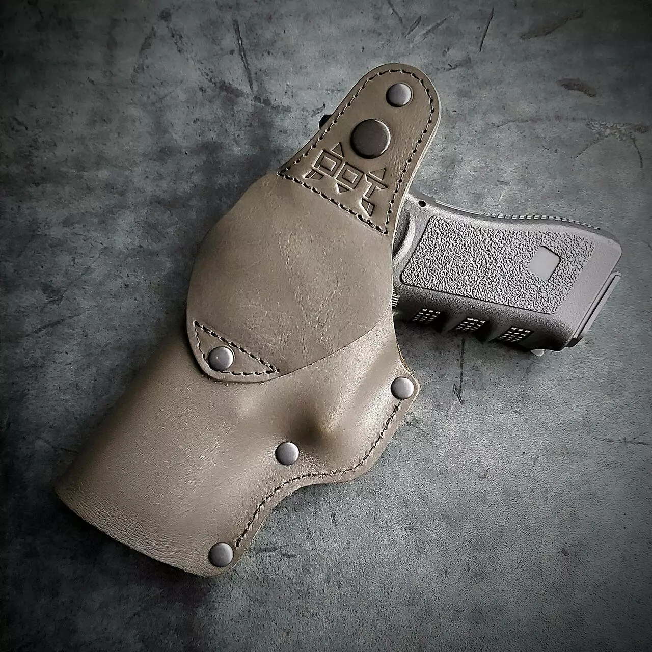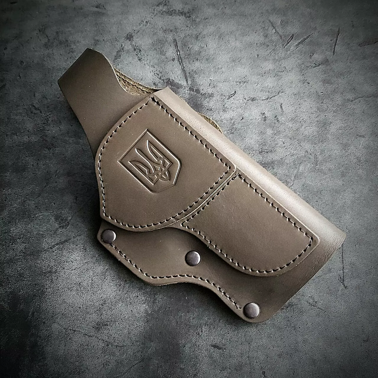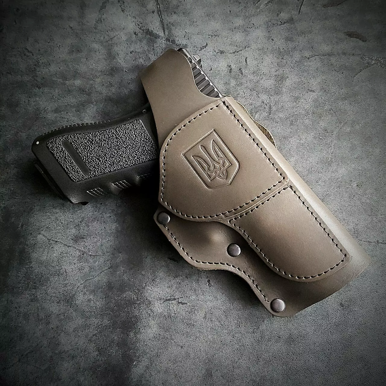 Шкіряна кобура поясна під GLOCK 17, олива з тисненням герб України