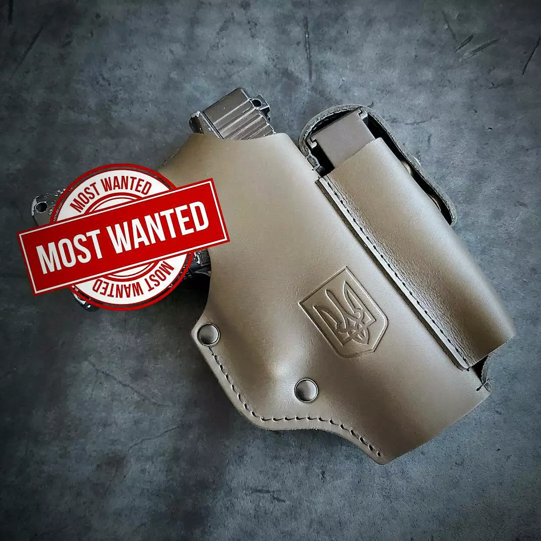 Шкіряна кобура поясна під Glock 19 | колір олива з гербом України