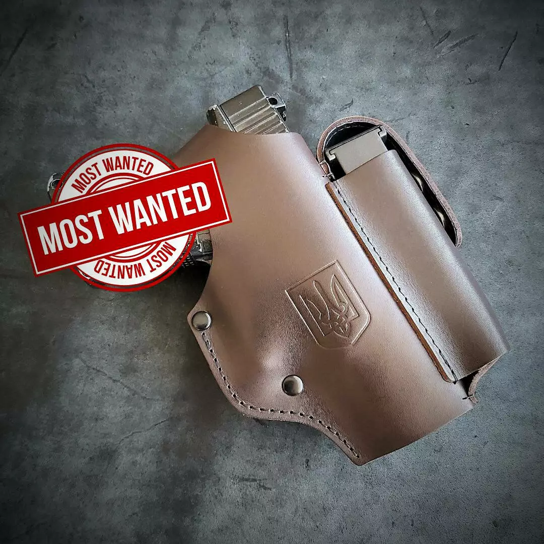 Шкіряна кобура поясна під Glock 19 | коричнева з гербом України